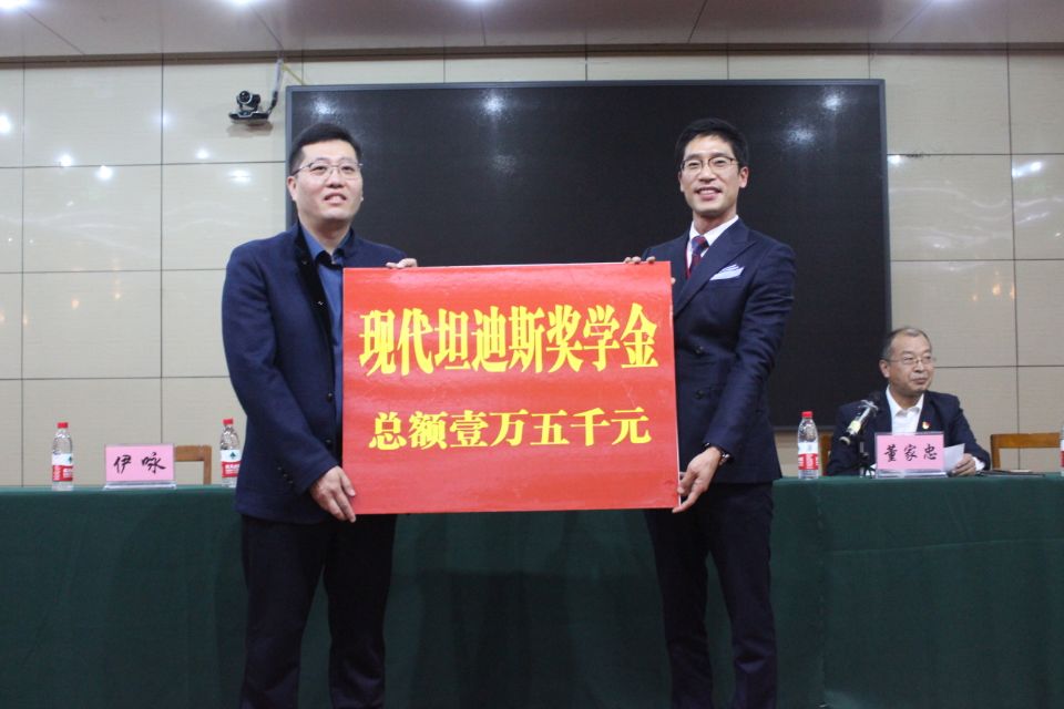 颁发仪式上,现代坦迪斯变速箱(山东)有限公司行政部曹寅補部长代表公司为翻译学院朝鲜语专业设立了总额一万五千元的现代坦迪斯奖学金,朝鲜语系主任周磊老师代表学院接受授权。至此,本次活动圆满结束。