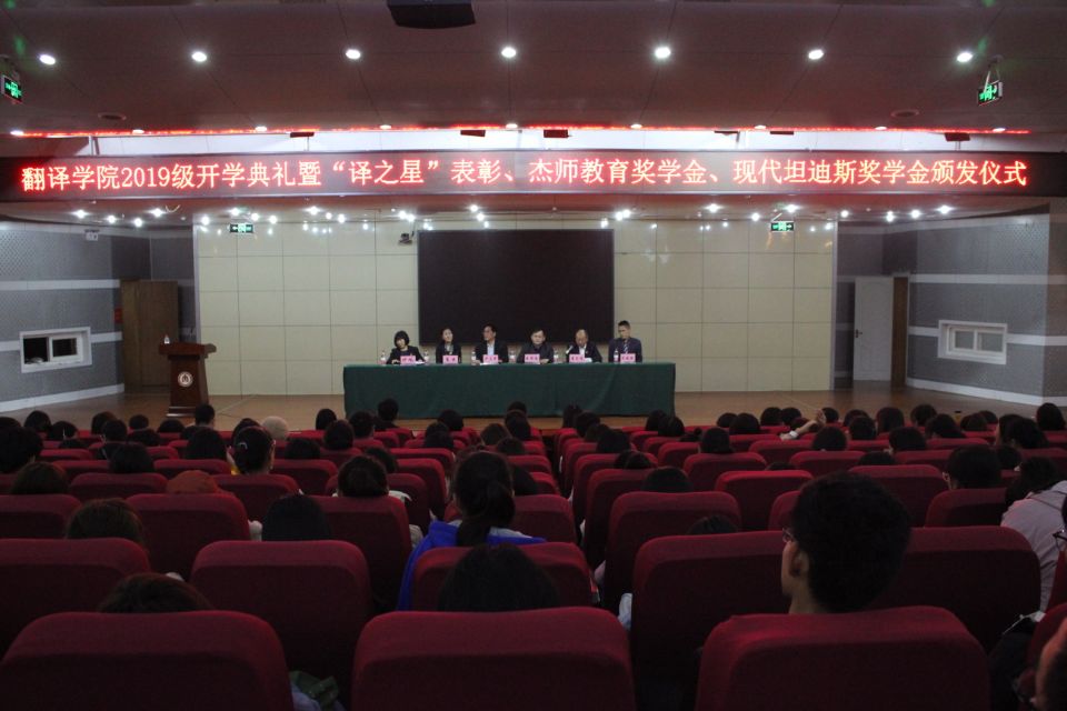 为强化学生的学习主体意识,提高学院学风建设水平,10月30日,翻译学院2019级“译之星”表彰、杰师教育奖学金颁发仪式于图书馆报告厅举行。翻译学院领导班子全体成员,北京杰师教育科技有限公司总经理王博远先生,现代坦迪斯变速箱(山东)有限公司行政部曹寅補部长出席颁发仪式,2019级全体新生参加了本次活动。