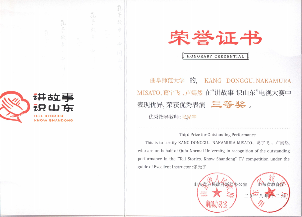 为讲好山东故事,传播山东声音,发挥高校大学生特别是驻鲁高校留学生文化传播使者的作用,展示新时代、新山东的发展变化,由山东省人民政府新闻办公室、山东省教育厅主办,山东教育电视台承办的“讲故事 识山东”电视大赛于2018年6月拉开帷幕,12月底完成录制和评选。