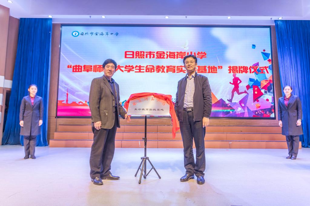 仪式上,赵庆英和学生生命教育研究中心团队负责人卢瑞霞签订半岛在线体育网与日照市金海岸小学生命教育实践基地合作协议,杨永明和宋百合共同为我校生命教育实践基地揭牌。