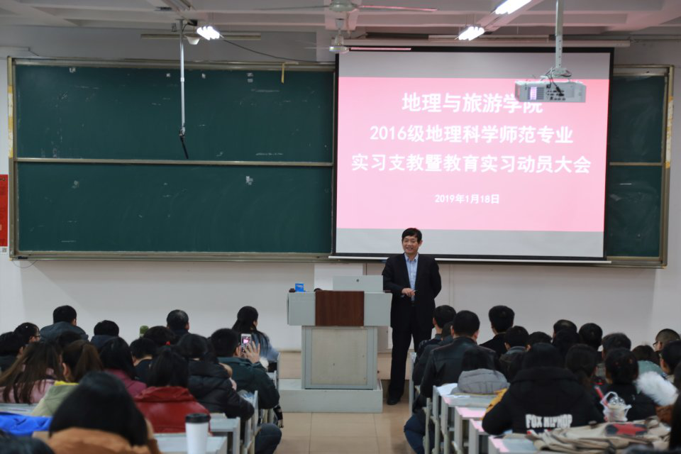为扎实推进师范生的教育实习工作,地理与旅游学院于1月18日下午召开2016级地理科学师范专业实习支教暨教育实习动员大会。学院党委书记胡长春、院长张全景、党委副书记刘伟出席会议,全体指导教师、2016级地理科学师范专业辅导员、班主任和全体学生参加了动员大会,会议由副院长吴军主持。
