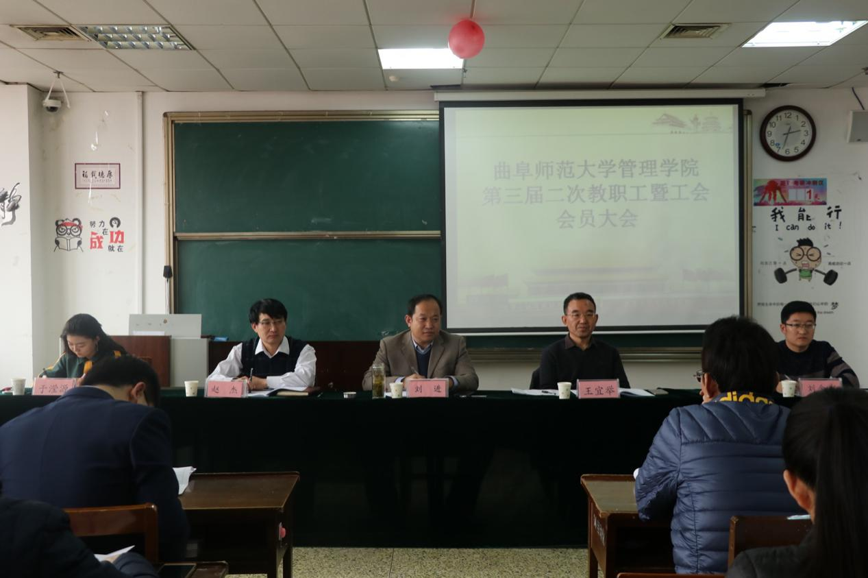 学院党委书记刘进在会上致闭幕词。他表示,这次大会是在学校高速发展、兄弟学院竞相跃进的形势下召开的一次大会,是管理学院盘点2018筹划2019,寻求突破的一次大会,更是一次凝聚人心、鼓舞干劲的大会。刘进充分肯定了2018年度学院在党建工作、教学科研、工会工作及学生工作中取得的成绩,并对2019年学院发展提出新要求。他指出,2019年是学院命运攸关的一年,要抓住学校高速发展的机遇,紧紧扭住管理科学与工程学科建设这一任务,广泛招才引智,力求管理学科科研突破,争创学校“高原学科”规划水准,为管理科学与工程博士点的申报积聚能量、准备条件;要加强谋划与布局,将“走出去”与“请进来” 结合起来,积极寻求与名校大家的联系与合作,推进科研团队、教学团队建设,助力青年教师成长,助推每位教师的事业发展;要坚持特色发展、科学发展,遵循教学科研要为地方和企业发展服务的原则,加强校地合作、校企合作;要认真落实立德树人的根本任务,以本为本,持之以恒加强教风学风建设,努力培养合格建设者和可靠接班人。他强调,大会是一个新的起点,希望全体教师、全体工会会员紧紧围绕学院发展这个中心和出发点,结合工作实际,充分发挥主力军作用,为学院的科学发展、特色发展、跨越发展、内涵发展做出新贡献,凝心聚力复兴运筹学研究的荣光,共同创造曲师大管理学科的辉煌。