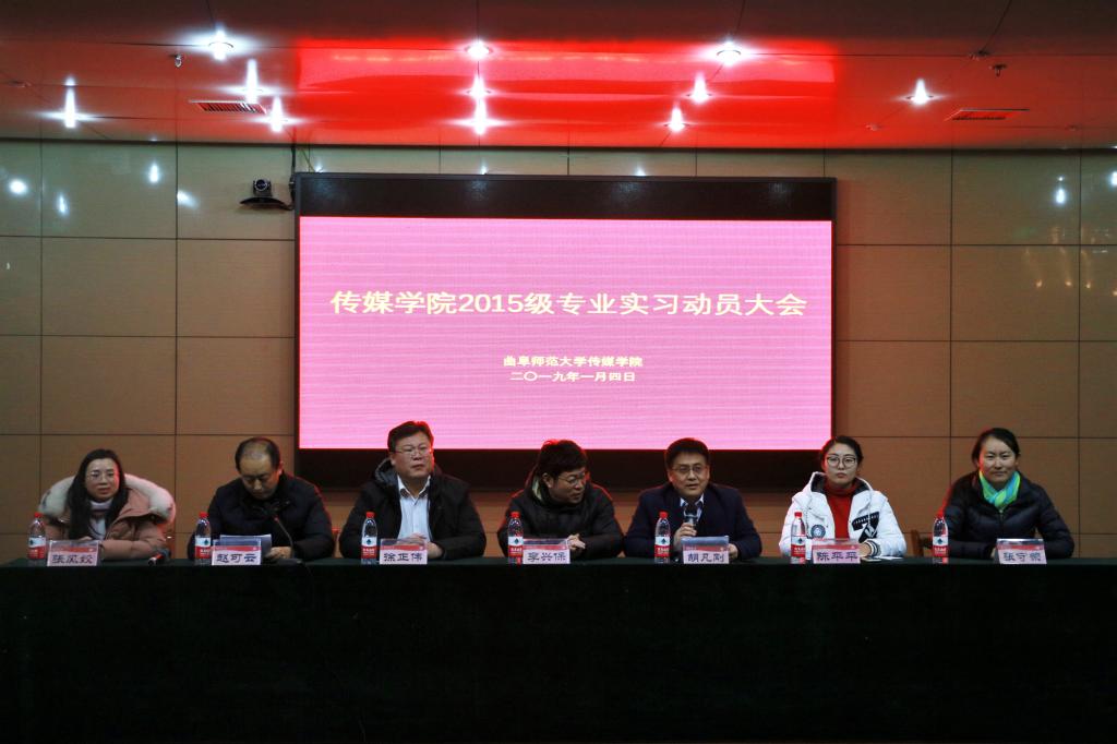 为明确实习目的和意义,为学生的就业打下坚实基础,传媒学院于1月4日晚举办2015级专业实习动员大会。 传媒学院党委书记李兴保、院长胡凡刚、副院长赵可云、党委副书记徐正伟,大众网日照记者站首席记者陈平平,以及有关辅导员老师与各专业指导老师,出席大会。