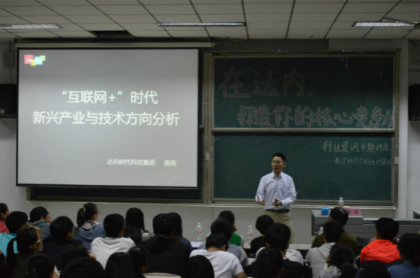 10月13日晚,由数学科学学院与达内时代科技集团共同主办的"互联网+"时代新兴产业与技术方向分析主题行业资讯专题讲座举行。达内集团教学总监唐亮担任本次讲座的主讲师,数学与统计学院党委副书记王作茂、达内集团驻半岛在线体育网老师张佩、数学科学学院辅导员郅艳梅和统计学院辅导员李玲参加了讲座。本次讲座由数学科学学院副院长王顶国主持。