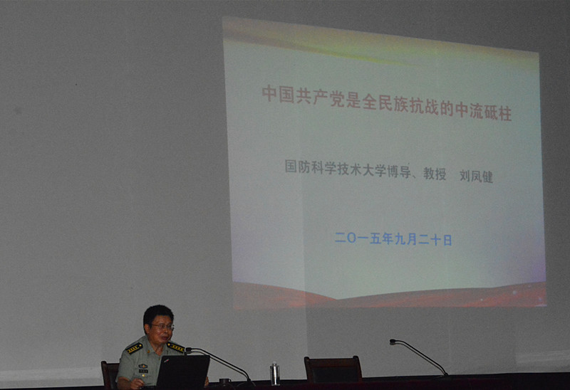 刘凤健从“中国共产党是抗日民族统一战线的领导者和维护者”、“中国共产党是全民族抗战胜利方向的引领者”、“中国共产党是敌后战场的开辟者和领导者”三个方面论证了主题。报告中,刘凤健列举了大量真实丰富的抗战史实、生动鲜活的案例故事,援引中外学者、名人、抗战亲历者的叙述和评论材料,带领同学们追溯中国共产党领导全国人民浴血奋战的峥嵘岁月,强有力地证明了中国共产党在抗战中的中流砥柱地位。