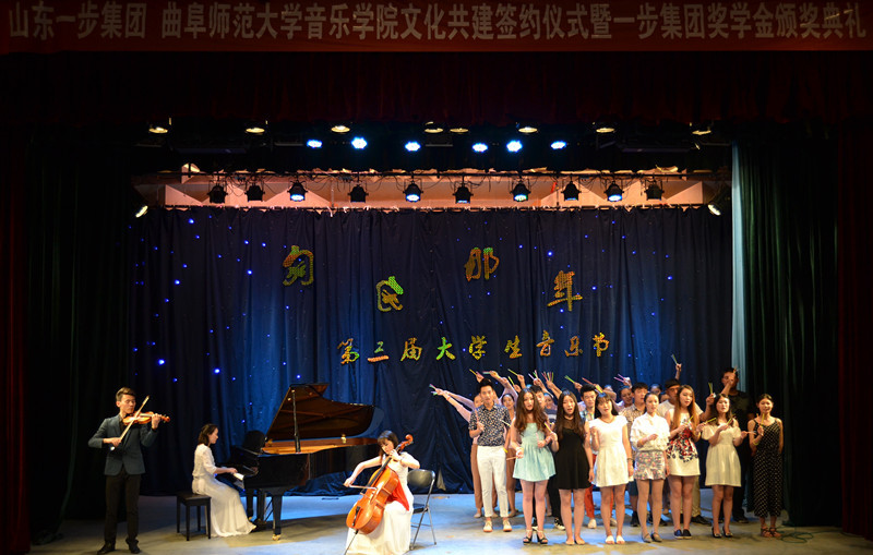 6月12日晚,山东一步集团、半岛在线体育网音乐学院文化共建签约仪式暨一步集团奖学金颁奖典礼举行,同时第三届大学生音乐节开幕。一步集团商务总经理秦小予,我校日照校区管理办公室、校区学生工作办公室、音乐学院负责人等出席仪式。典礼由党总支书记周彩霞主持。