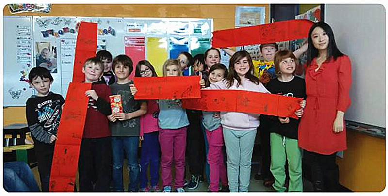 细微的美好每天都出现在我的生命之中。走在小小的校园里,孩子们热情地跟我打招呼,短短几个月间我得到的笑脸与拥抱甚至比人生的头二十年还要多;上课前大一点儿的孩子总是帮我把电脑、投影和音响准备好;在学校附近的超市买洗发水碰到热情地学生家长把自己的优惠券给我用……这个酷寒的国度,这个偏远的小城,用它特有的方式包容着我,温暖着我,也考验着我。初来乍到,从校长到学生,大家都对中国知之甚少,对以怎样的方式开设中国语言文化的课程更是一无所知。经过了漫长的等待和员工会议上的讨论,我们终于商定了上课的形式和时间。走在学校的回廊里,孩子们总会问我“今天来我们班吗?今天不来的话哪天才来呢”,说话时眼睛里闪着光芒。他们对古老又遥远的中国充满了好奇,而他们对中国的了解却近乎为零。让孩子们对中国有个大概的印象是十分必要的。我知道我要展示的不仅仅是有故宫长城、郑和下西洋的伟大而又古旧的中国,更是有高铁航母盛世开太平的活力中国。我们一起比较中国和加拿大的地理概况,探讨人脑习得不同语言的巧妙机制,分享彼此的节庆习俗……经过一段时间的接触,师生们惊叹于中国的大中国的古,更期待亲眼去看看当代中国的美,亲身去体验中国与加拿大的不同。圣诞节前,孩子们兴奋地告诉我,他们的心愿是养只熊猫做宠物。在语言学习方面,孩子们也给我带来了很大的惊喜。我的学生年龄都不超过十二岁,正处在语言习得的黄金时期。一开始,孩子们对自己母语里并 不 存 在 的 “x”、“sh”、“j”、“q”等音素十分抵触,不愿意开口尝试。我深知,微笑是最大的鼓励和肯定。在课上,每当孩子们低下头不好意思张口的时候,我都会微笑着凝视他们,引导他们。不出几天,孩子们已经可以字正腔圆地说“谢谢”了。至于老大难的声调问题,我“发明”了一套简单的“声调小体操”,带领孩子们根据调值的变化伸展四肢,孩子们在轻松欢快的气氛中,蹦蹦跳跳地就把声调掌握好了。另外,儿歌也是我的一大法宝。孩子们摇头晃脑,跟着视频一起唱歌,不知不觉地就学会了好多中文的词汇。