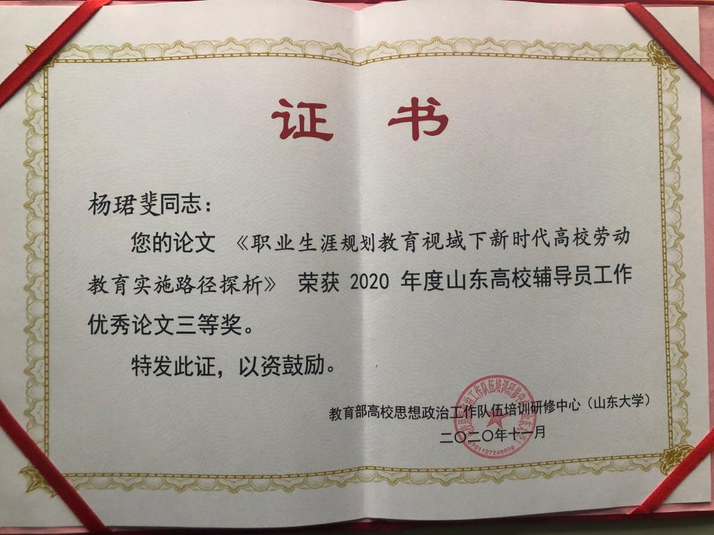 在2020年山东高校辅导员工作论坛中,我校生命科学学院辅导员杨珺斐的论文《职业生涯规划教育视域下新时代高校劳动教育实施路径探析》荣获三等奖。