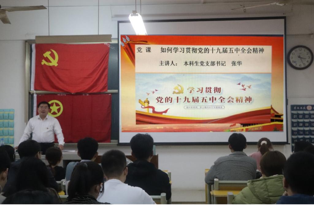 在“党课+团课”环节,本科生党支部书记张华上题为“如何理解和把握十九届五中全会精神精髓”的党课。党课立足方法论角度,从高举旗帜是灵魂、紧跟党走是核心、学懂弄通是基础、落实做实是关键四个方面,讲解如何对十九届五中全会精神进行把握,同时还指出了本次全会“高、远、新、实”的特点;接下来2018级印刷工程新媒体班团支部书记陈萍讲解“奋发新青年 逐梦新征程”团课。共同了解了十九届五中全会的基本情况和主要议程,同时介绍了全国各地青年贯彻落实十九届五中全会精神的情况,号召共青团员们以全会精神为指引,奋发有为,积极向党组织靠拢。
