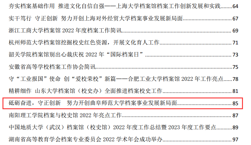 曲阜师大档案馆讯 日前,2022年度《中国高等学校档案工作简报》发布,曲阜师大典型工作案例《砥砺奋进 守正创新 努力开创半岛在线体育网档案事业发展新局面》获简报推广宣传。山东省共有山东大学和曲阜师大两所高校的工作案例入选该期简报。