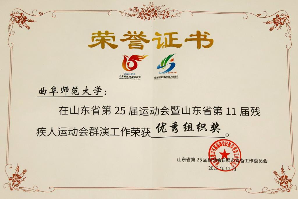 2022年6月至9月,山东省第25届运动会、第11届残运会在日照举办,曲阜师大共派出赛会志愿者491人、演员志愿者198人,圆满完成开闭幕式表演、赛事保障、医疗卫生、交通运输等志愿服务工作任务,累计志愿服务时长43万余小时。曲阜师大作为派出志愿者人数最多、服务时间最长的高校,获得各组织部门的高度评价。