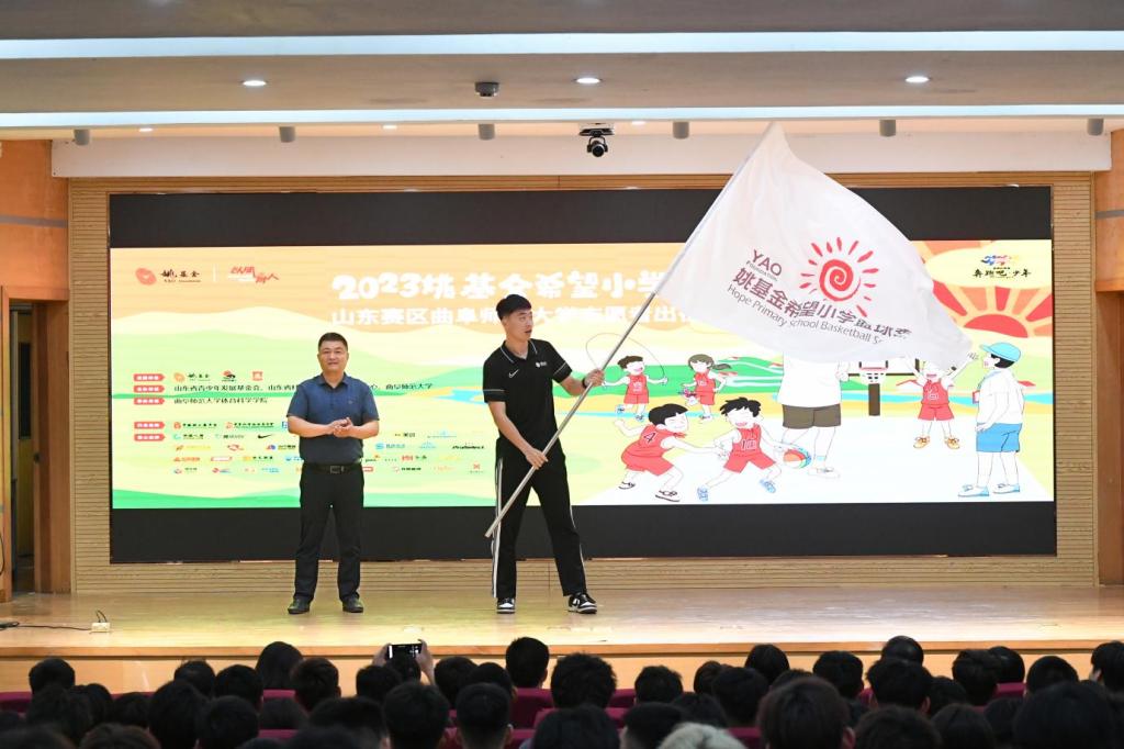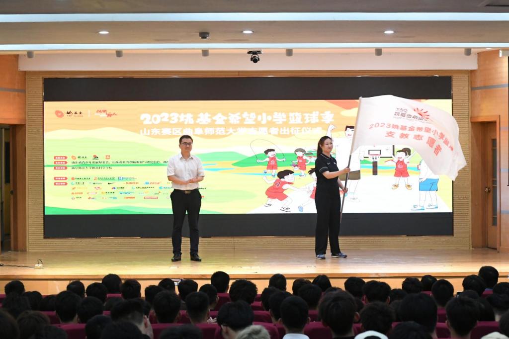 山东省青少年发展基金会资助部部长董晓峰为志愿者代表李柯阳授姚基金希望小学篮球季旗,半岛在线体育网团委书记孔轶众为志愿者代表马蔓妮授姚基金希望小学篮球季支教志愿者旗。
