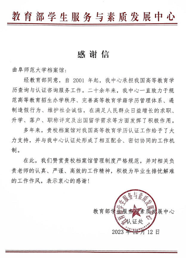 曲阜师大档案馆讯 近日,教育部学生服务与素质发展中心向学校发来感谢信,对档案馆在高等教育学历认证工作中给予的大力支持表示衷心感谢。感谢信高度赞扬了档案馆严格规范的管理制度,相关负责老师认真、严谨、高效的职业精神以及主动为毕业生排忧解难的务实作风。