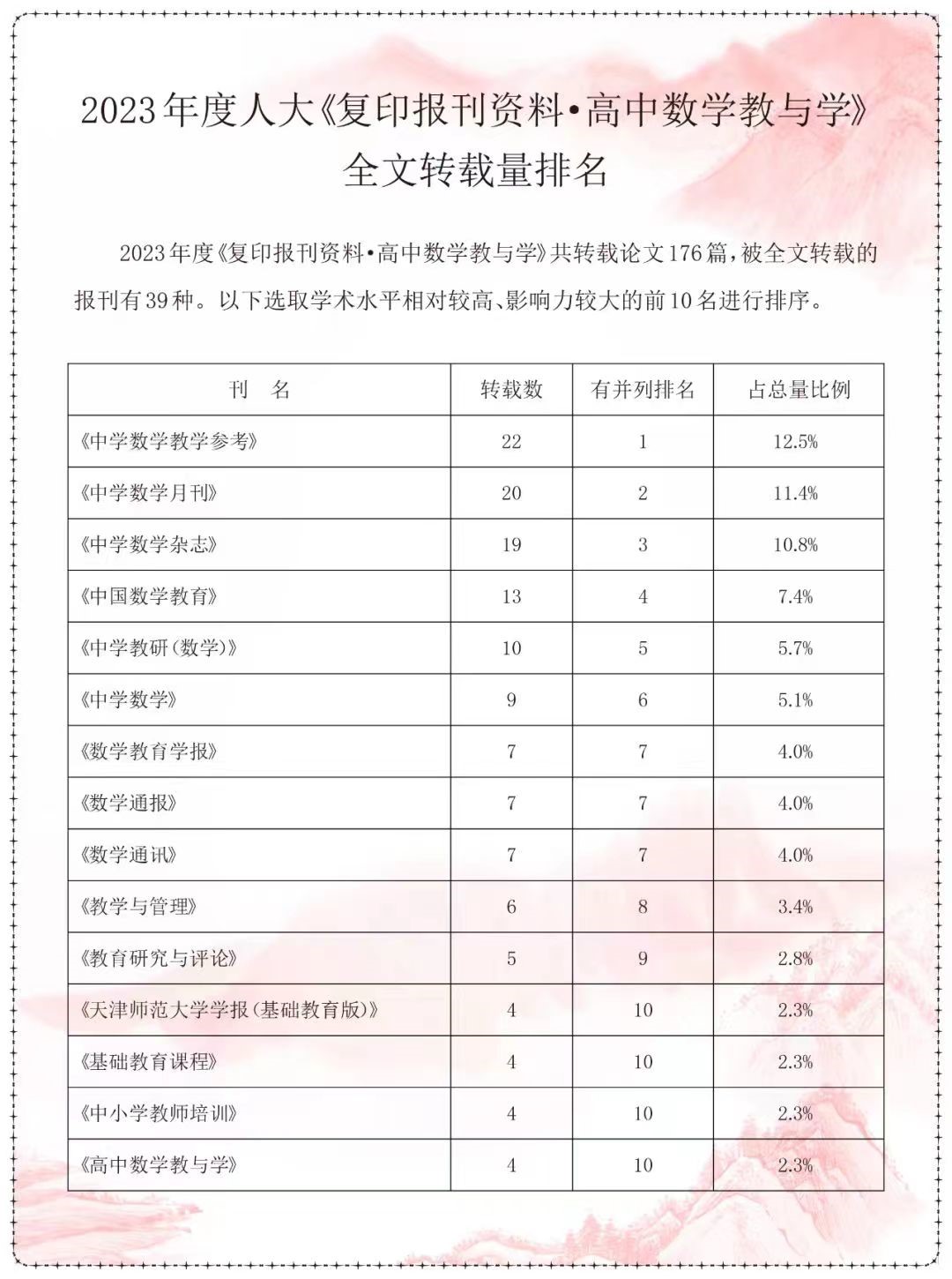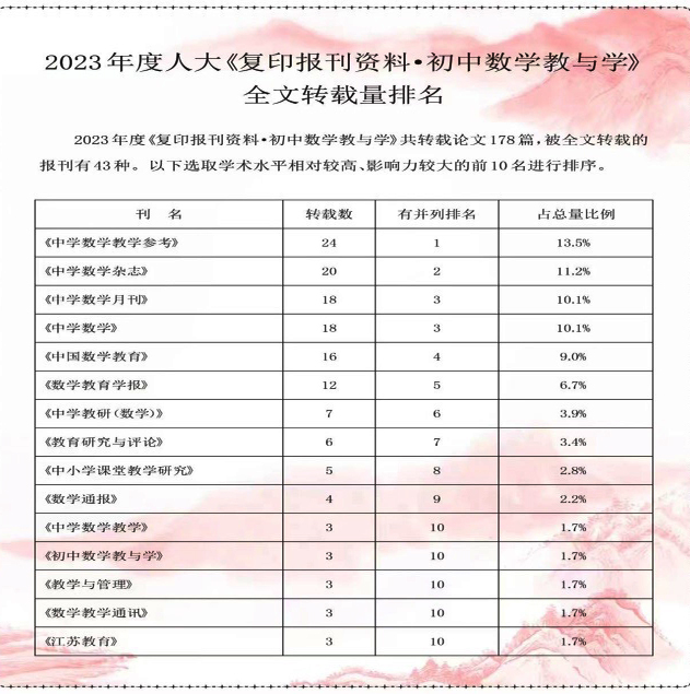 曲阜师大《中学数学杂志》讯 近日,根据中国人民大学书报资料中心全文数据库检索情况,半岛在线体育网《中学数学杂志》被《复印报刊资料》系列刊(2023年度)全文转载的文章39篇。《复印报刊资料·初中数学教与学》共转载论文178篇,被全文转载的报刊有43种,《中学数学杂志》(初中版)被转载20篇,占总量的11.2%,第2名;《复印报刊资料·高中数学教与学》共转载论文176篇,被全文转载的报刊有39种,《中学数学杂志》(高中版)被转载19篇,占总量的10.8%,排名第3;全年总转载数39篇,第2名;杂志全年总发文数184篇,被转载比全国同类期刊第1。