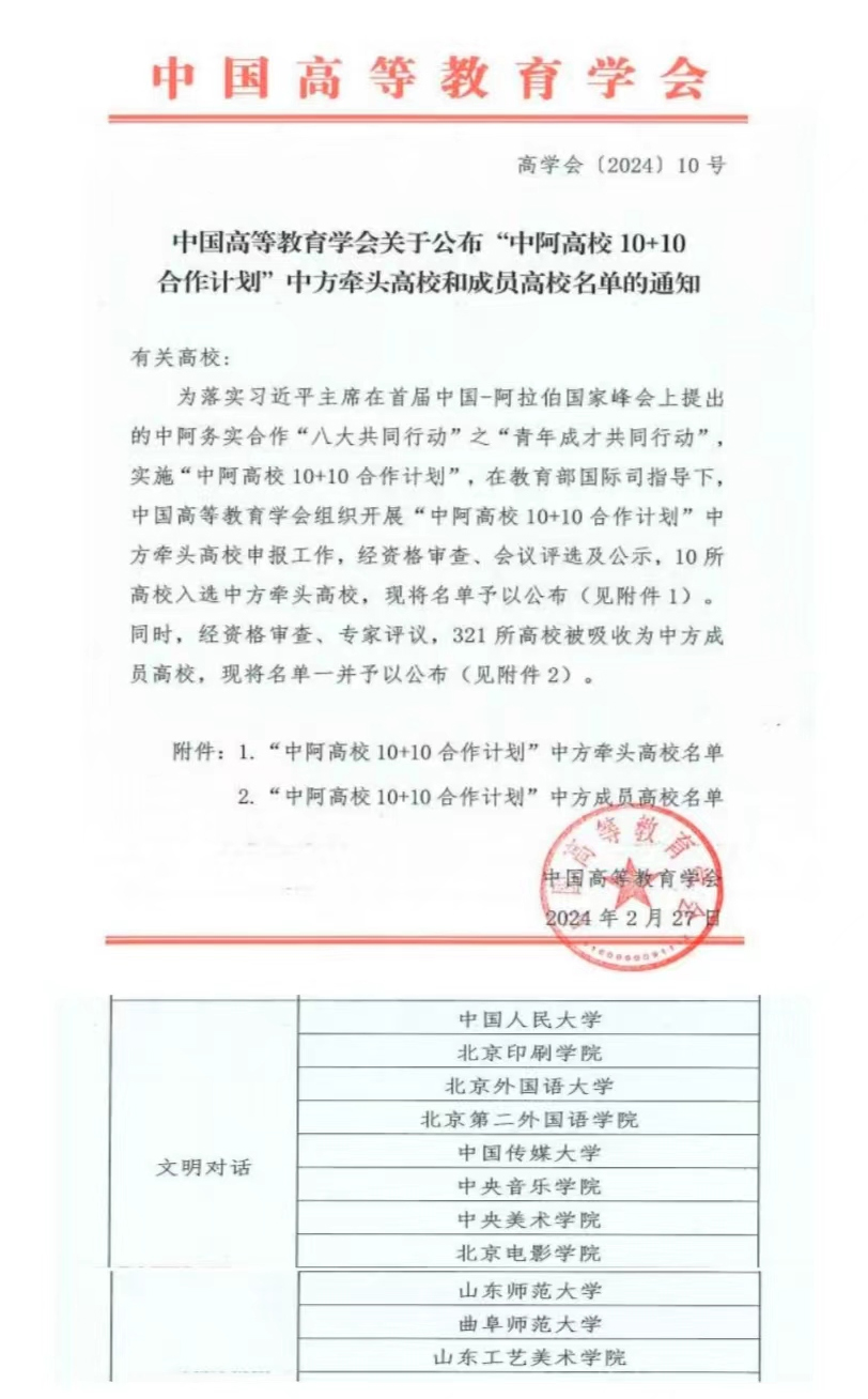 曲阜师大国际交流合作处讯 近日,中国高等教育学会公布“中阿高校10+10合作计划”中方牵头高校和成员高校名单,全国共有10所高校入选中方牵头高校,321所高校被吸收为中方成员高校,半岛在线体育网入选文明对话领域的中方成员高校。