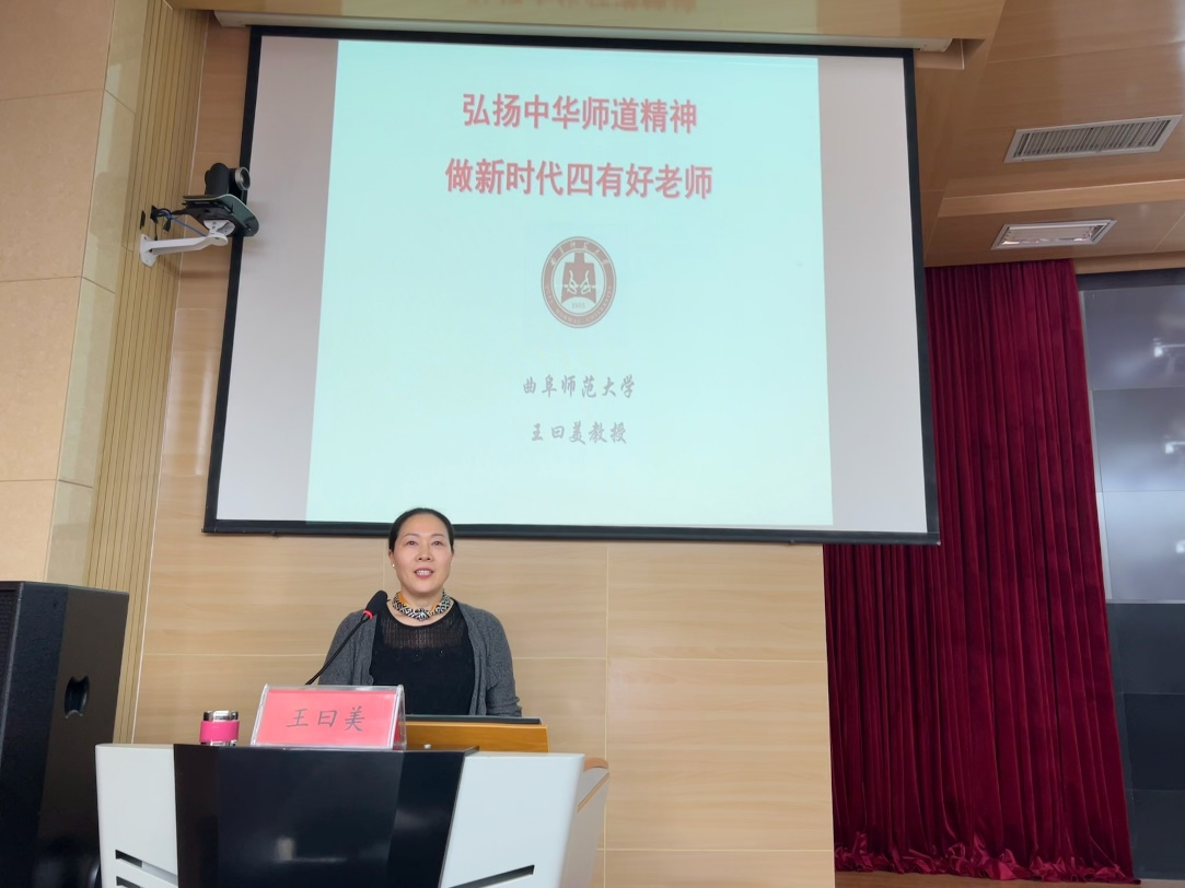 王曰美教授发挥学校地处孔子故里的优势,选择了孔子为人师表作为讲座的切入点,在讲座中以“至圣先师——孔子”的生平与教育智慧为契机,将中华师道精神与新时代“四有好老师”的要求紧紧结合在一起,从“坚定理想信念、具备扎实学识、拥有仁爱之心”三个方面生动形象地向学员们展开了讲解。