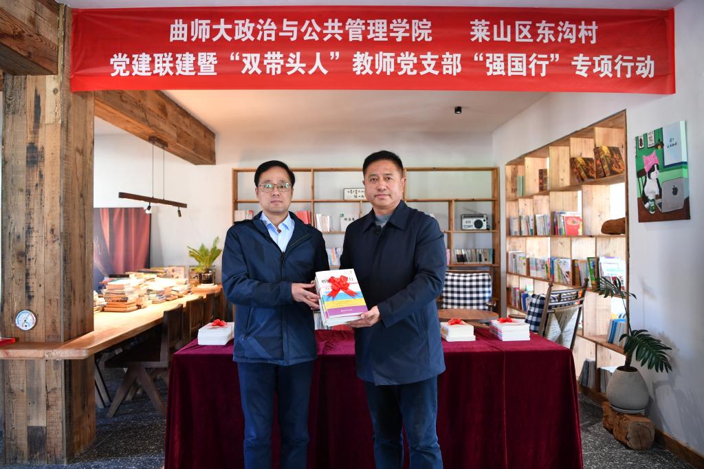 李增元代表学院向东沟村支部书记、村委会主任刘维波赠送了600余册图书,旨在丰富东沟村村民的精神文化生活,助力乡村文化振兴。