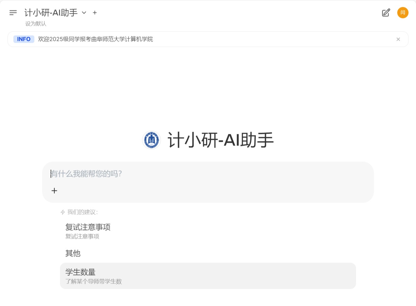 曲师大计算机学院讯 3月10日,计算机学院在智慧校园建设领域取得新进展,由学院人工智能未来产业研究团队尚军亮教授、闫超副教授联合日照数云图信息科技公司共同研发的"计小研-AI助手"正式上线。该系统采用本地化部署的DeepSeek与QwQ-32B大语言模型,构建起覆盖研究生教育全周期的智能服务体系。