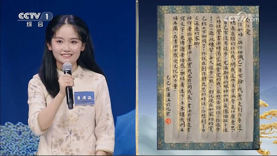 在8月13日播出的第三集中,崔潇涵围绕“致海外留学生的一封信”主题进行的精彩发言,她以自己与海外留学生“乔仁爱”学习书法的真实互动为蓝本,现场创作书信,生动诠释了书法作为中华文化的重要载体,如何在异国他乡播撒种子、滋养心灵,搭建起人与人之间、文化与文化之间理解与共鸣的桥梁。她的真挚表达引发全场共鸣,赢得了现场专家评委的高度评价。