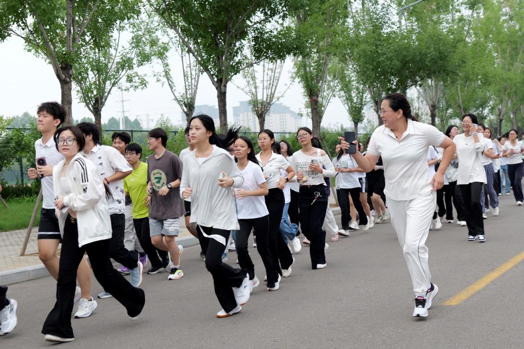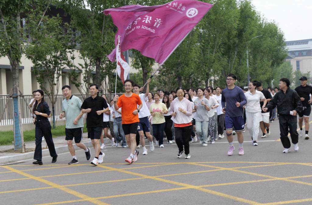随着发令声响起,2025级新生们精神抖擞地从闻韶楼出发。围绕西校区环校路,穿梭于美丽的校园之中,途径孔子书院、中国教师博物馆、格物楼、木铎广场、致知楼、体育馆、游泳馆等标志性建筑,每一步都踏出了青春的节奏,每一滴汗水都闪耀着拼搏的光芒。这场“奔跑”不仅是一次体能锻炼,更被赋予了深刻的寓意:它象征着新生们在艺术道路上的永不停歇,向着未来的无限可能奋力前行。