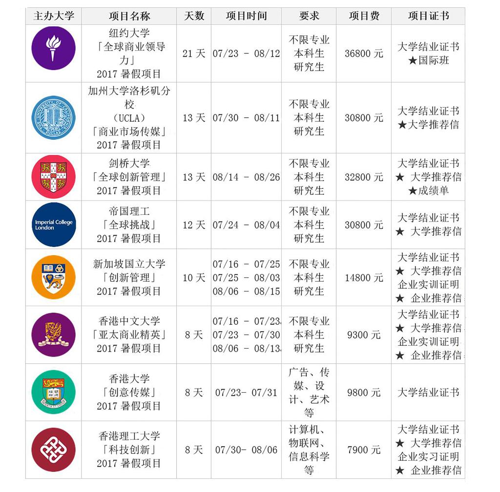 为了让我校学生能开拓国际视野,拥有更多的海外交流学习的机会,更好地参与企业实践活动,今年暑假期间我校将推出纽约大学、加州大学洛杉矶分校、剑桥大学、帝国理工、新加坡国立大学、香港中文大学、香港大学、香港理工大学主办的学生海外访学实践项目,此项目面向全校同学开放,欢迎同学们积极报名。