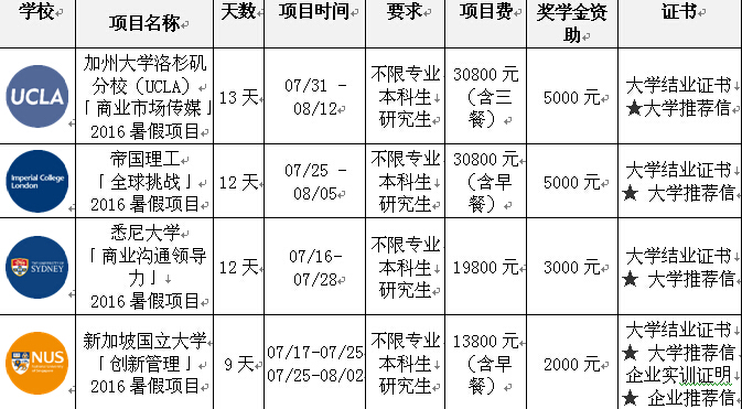 为进一步推进我校国际化、开放性办学进程,有效满足我校学生赴国(境)外高校学习的需要,拓宽我校学生赴海外交流学习的平台,更好地参与海外高校举办的高端校外实践活动,我校特推出暑期赴美国加州大学洛杉矶分校、英国帝国理工、澳大利亚悉尼大学、新加坡国立大学、中国香港特别行政区香港中文大学、日本(纽约大学东京中心)主办的系列大学生海外学习实践项目。具体信息如下: