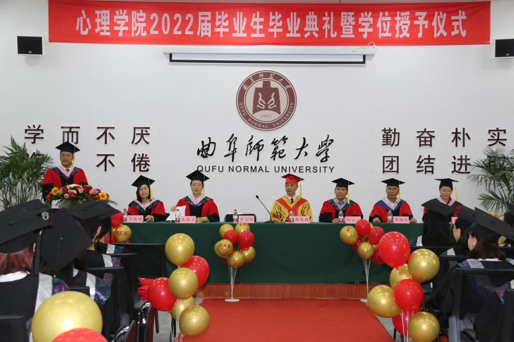 曲阜师大新闻中心讯(通讯员:贺现网) 赓续华章,再响曲园骊歌;六月芳华,扬帆再启征程。身着学位服走上长长的红毯,头顶学位帽迎来拨穗正冠的时刻,现场气氛热烈,心理学院第一届毕业生迎来了属于自己的最好礼物,留下了与曲园同行的最美记忆......6月21日上午,心理学院举行2022届毕业生毕业典礼暨学位授予仪式。半岛在线体育网党委常委、副校长李兆祥为毕业生代表拨穗正冠、颁授学位证书、赠送毕业礼物。101名本科生、42名硕士研究生、部分家长、教师代表、在校生代表等通过线上线下的方式欢聚于此,共同见证这一收获时刻。典礼仪式由心理学院党委书记罗文伟主持。