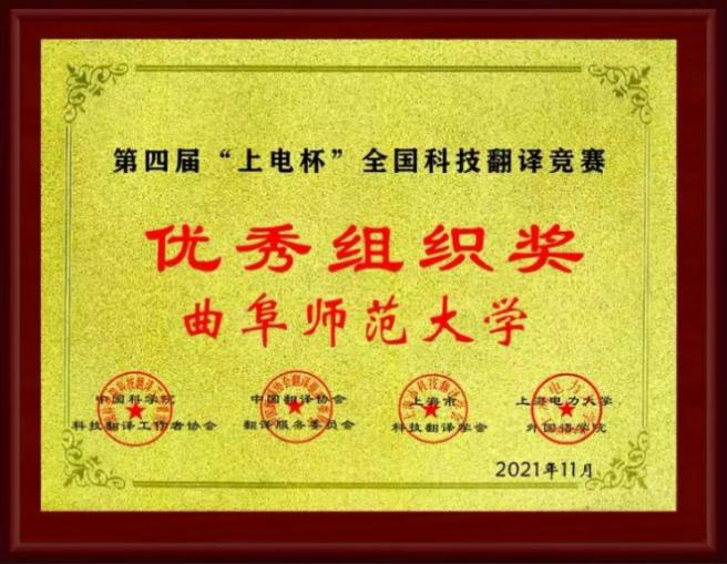 曲阜师大新闻中心讯 (通讯员:岳媛) 11月28日,由上海市科技翻译学会主办、上海电力大学承办的第四届“上电杯”全国科技翻译大赛结果揭晓。我校2021级英语笔译专业研究生岳媛获得英译汉组三等奖,2020级英语笔译专业研究生贺敏获得英译汉组优胜奖,2021级英语笔译专业研究生王琪、2018级商务英语专业本科生丁森获得汉译英组优胜奖。曲阜师大荣获“优秀组织奖”,伊咏教授、石艳玲副教授获得“优秀指导教师”荣誉称号。