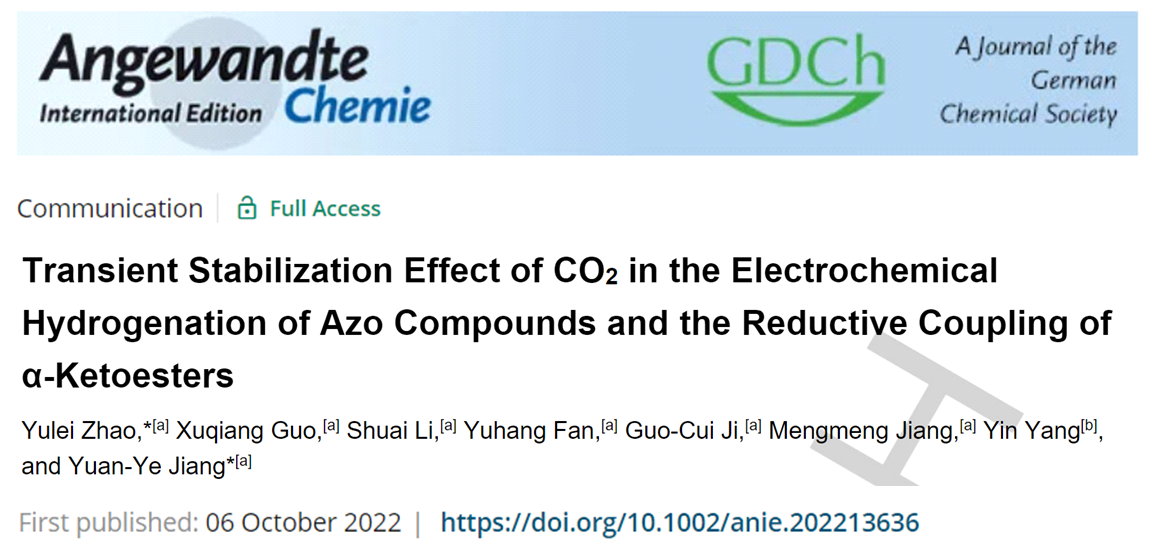 曲阜师大科技处讯 近日,曲阜师大化学与化工学院赵育磊副教授与蒋原野副教授合作,在二氧化碳利用领域取得突破性进展,相关研究成果发表在国际顶级期刊《德国应用化学》(Angewandte Chemie International Edition)上,论文题为“Transient Stabilization Effect of CO2 in the Electrochemical Hydrogenation of Azo Compounds and the Reductive Coupling of α-Ketoesters” (DOI: 10.1002/anie.202213636,文章链接:https://onlinelibrary.wiley.com/doi/10.1002/anie.202213636)。半岛在线体育网为该论文的唯一通讯单位,赵育磊副教授为该论文的第一作者和通讯作者,蒋原野副教授为该论文的共同通讯作者。《德国应用化学》于1962年由John Wiley and Sons Ltd出版,是化学和材料领域的国际顶级期刊。JCR分区为一区,当前影响因子为16.823。