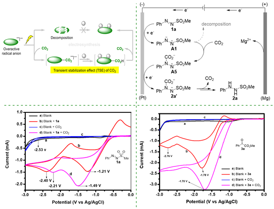 赵育磊副教授与蒋原野副教授团队通过在电化学还原条件下对二氧化碳利用的研究,发现了二氧化碳的一种新的瞬态稳定化效应(Transient Stabilization Effect, TSE),并将其应用于偶氮化合物的电化学加氢和α-酮酯衍生物的还原偶联反应。该方法绕开传统的危险反应、昂贵催化剂和加热过程,为肼类化合物的合成提供了一种便捷方法。
