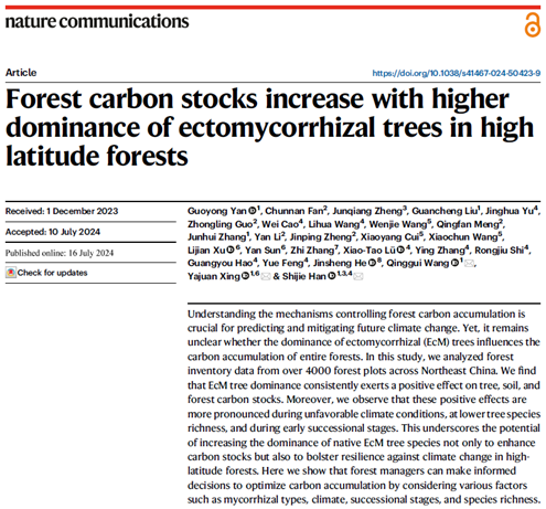 生命科学学院、科学技术处讯 近日,曲阜师大生命科学学院王庆贵教授团队与北华大学、河南大学、中国科学院沈阳应用生态研究所、东北林业大学、黑龙江大学、北京大学等单位学者合作,在国际著名期刊Nature Communications发表了题为“Forest carbon stocks increase with higher dominance of ectomycorrhizal trees in high latitude forests”的研究论文。半岛在线体育网为该论文的第一署名单位和通讯单位,闫国永副教授为论文的第一作者,王庆贵教授、邢亚娟教授和韩士杰教授为论文的共同通讯作者,刘冠成博士和张军辉教授作为共同作者参与了该论文的部分工作。